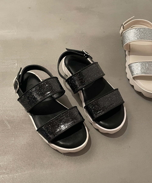 ◆お客様のご要望にお応えして生まれた大人っぽサンダル!◆ 【デザイン】 ・お子様でも安心して履ける程よい厚底デザイン。 ・履きやすいクッションインソール。 ・ギザギザの形のソールがオシャレな雰囲気◎ ・ラメのグリッターとフェイクレザーの組み合わせがおしゃれ。 ・足首のベルトは調整可能。 ・カラー展開は定番のブラックとトレンド感のあるシルバーの2色展開。 【スタイリングポイント】 ・春先は靴下と合わせて、夏は素足で長い期間スタイリングを楽しめる。 ・おしゃれなデザインなので、シンプルな洋服と相性抜群! ・ショートパンツやミニスカートやワンピースと合わせて夏らしい印象に。 【スタッフレビュー】 普段のスニーカーサイズ:20㎝ 着用:20㎝ コメント: きつすぎず、緩すぎず、丁度良いサイズ感でした。 ストラップの裏にゴムがついている仕様なので、 一度足首に合わせてサイズを調整すれば、その後は、すぽっと履けて着脱も簡単でした。 厚底ですが、とても軽いので、驚いていました。 インソールのクッションも効いているので、足当たりも良いとの事です。 ラメもグリッターと違い、ポロポロ落ちない素材が◎ -------------------- ≪お気に入り登録機能の使い方≫ ■商品のお気に入り登録(ハートマークをクリック) 再入荷通知や値下げ等、お得なご案内を受けることができます。 -------------------- ※一部WEB限定販売です。 ※サンプルでの撮影となるため、実際にお届けする商品と仕様やサイズが異なる場合がございます。 ※商品画像は、光の当たり具合やパソコンなどの閲覧環境により実際の色味と異なって見える場合がございます。 商品の色味の目安は商品単体の画像をご参照ください。