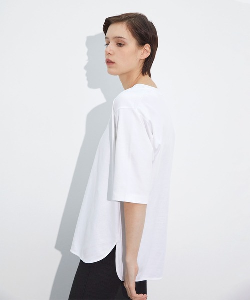 シルエットにこだわった高機能ラウンドヘムTシャツ クリアな目面の微光沢が美しいカットソー。前後差がついたラウンドヘムTシャ ツです。 腕が細くみえる袖感と、シルエットが綺麗にみえるサイズ感にこだわりました。 一枚でさらっとレイヤードしてスタイリングのポイントにもお使いいただけます。 接触冷感、汗染み防止、紫外線防止と暑い時期に嬉しい高機能付き。 シンプルなTシャツは、マストで手に入れてただきたいおすすめのアイテムです。 ※照明の関係により、実際よりも色味が違って見える場合があります。予めご了承ください。 商品の色味は、商品単品画像をご参照下さい。