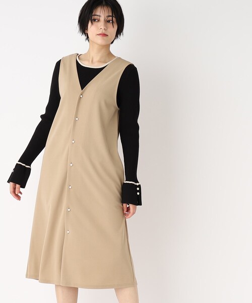 ジレにもジャンスカにも3WAYで着用可能! パール調ボタンが華やかなジャンパースカート 【素材】 ・ツイル織の柔らかな光沢感のあるカットジョーゼット素材を使用。 ・繊細な凹凸のある表面感がボディラインを優しくカバー。 ・肉感があり、程よいハリがありつつも肌離れの良い素材なので、シーズンレスで活躍します。 ・ジャージ素材なのでご自宅でお洗濯可能。 イージーケア素材なので、洗濯後のアイロンもらくちんです。 ※裏地なし 【デザイン】 ・前開きのストンとしたシルエットのジャンスカタイプ。 ・パール調ボタンが華やかでさりげなく、indexらしい上品できれいめな印象にスタイリングを仕上げてくれます。 ・前をすべて開けるとジレとしても着用していただけます。 ・バックボタンで着用もできるので、3WAYで着用可能! ・サイドポケット付きなのも嬉しいポイントです。 ※ポケット数:横×2 こちらの商品は主に春に着用いただける商品です。 モデル情報:身長163cm B80 W60 H89 着用サイズ:38(M) 店舗へのお問い合わせ商品番号:C58-56028 ●製品寸法: 36(S):着丈105cm B82cm 肩幅31cm W88cm H102cm 38(M):着丈106cm B85cm 肩幅32cm W92cm H105cm 40(L):着丈108cm B88cm 肩幅33cm W96cm H108cm 42(LL):着丈110cm B92cm 肩幅34cm W100cm H112cm 備考: