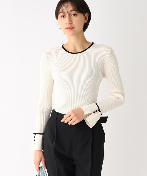 一枚でもインナー使いでも華やぐ配色使いがポイント! エコヴェロレーヨンを使用したすっきりリブニット ・レーヨンとポリエステル素材をブレンドしたニットを使用。 ・ちくちくせず、肌離れも良いファインゲージ編みの着心地軽やかなこの時期にぴったりな肉感です。 ・フィット感のあるリブ編みですっきり見え。 ・レーヨンはレンチング社のEcovero(TM)を使用した、環境に配慮したサスティナブルな素材を使用しています。 ※製品寸法は平置きのスペックとなっております。こちらの商品は伸縮性があります。 ※こちらの商品はやや透け感があるため、インナーの着用をおすすめします。 ※レンチング(TM)エコヴェロ(TM)とは ・認証され管理された森林から得られた持続可能な木材とパルプを原料とします。 ・原料の抽出から生産、流通、廃棄までの全ライフサイクルを通して高い環境基準に適合する繊維として、EUエコラベル認証を取得しています。 ・最終製品での使用を確実に特定できるため、購入の際にエコヴェロ(TM)ビスコース繊維が含まれていることを確信していただけます。 【デザイン】 ・スリーブのブロッキング配色とボタンが、さりげない華やぎをプラスしてくれるデザインニット。 ・袖口にスリットを施し、軽やかで今年らしいこなれたポイントに。 ・開きすぎないクルーネックで上品見え。 ・ファインゲージ編みなのでインナー使いにも◎ジャンスカのインナー使いにもおすすめです。 【カラー】 ・503カラーはホワイトのボディーにブラックの配色 ・519カラーはブラックのボディーにホワイトの配色 ・591カラーはブルーグレーのボディーにホワイトの配色です。 こちらの商品は主に春に着用いただける商品です。 モデル情報:身長168cm B76 W58 H86 着用サイズ:38(M) 店舗へのお問い合わせ商品番号:C58-16034 ●製品寸法: 36(S):着丈54cm B54cm 袖丈54cm 肩幅24cm 38(M):着丈55cm B57cm 袖丈54cm 肩幅26cm 40(L):着丈57cm B60cm 袖丈55cm 肩幅28cm 42(LL):着丈59cm B64cm 袖丈56cm 肩幅30cm 備考:
