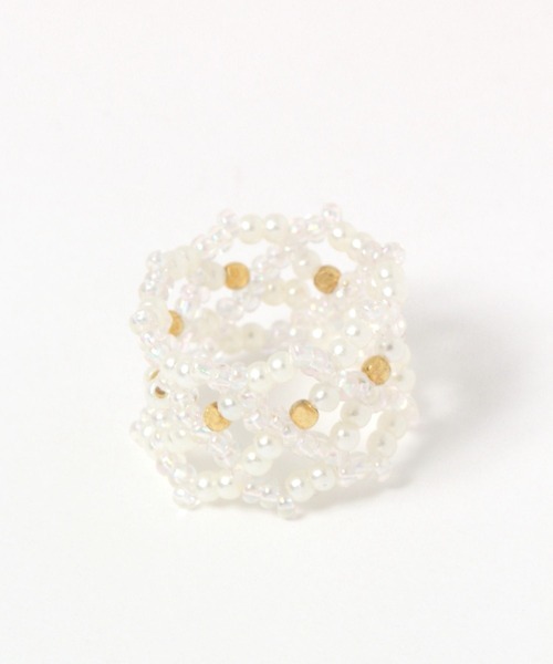 ーーー小さなビーズを編んで幅広リングに仕上げたビーズリング。伸縮するタイプで着脱簡単◎華やかなパールのデザインが指先を彩ってくれます。程よいボリューム感がコーディネートのアクセントになります。ーーー