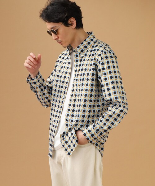 ■コーディネートのアクセントに活躍する幾何学柄プリントシャツ 【デザインポイント】 ・インポートファブリックシャツ ・インナー使いから単品使いまで着まわせるベーシックサイズ 直線や幾何学的形態が特徴のアール・デコ様式を彷彿とさせるプリントが目を惹くボタンダウンシャツ。 ベーシックなサイジングで、ジャケットやブルゾンのインにアクセントとして加えたスタイルがオススメです。 ※ポケット数:胸元×1 【素材・特性】 イタリア3大生地メーカーのひとつ『TESSITURA MONTI(テッシトゥーラ モンティ)』のシャツ地を採用。 最新鋭の技術を取り入れ、原綿から製品までを一貫して生産しており、デザインの豊富さ、卓越した色彩が世界から高く評価されているメーカーとなります。 こちらの商品は主に春に着用いただける商品です。 モデル情報:身長178cm B85 W70 H88 着用サイズ:03(L) 店舗へのお問い合わせ商品番号:205-86003 ●製品寸法: 01(S):着丈72cm B111cm 袖丈61cm 肩幅43cm 02(M):着丈74cm B115cm 袖丈62cm 肩幅45cm 03(L):着丈76cm B119cm 袖丈63cm 肩幅46cm 04(LL):着丈78cm B123cm 袖丈64cm 肩幅48cm 備考: