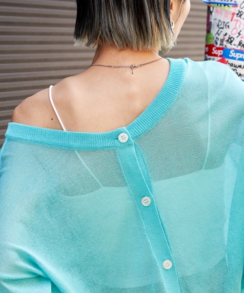カーディガン×プルオーバーと前後2WAYで楽しめる■designカーディガン・ボタン側を後ろにしてプルオーバーとして広めの襟元でオフショル風になど様々な雰囲気で楽しめるカーディガン。長めの袖口リブで、くしゅっとしたデザインで女性らしさをプラス◎ゆったりしたサイズ感と、ヘルシーな肌見せが叶うシアー素材は春夏の羽織りとして大活躍するアイテム!■materialシャリ感のある糸を使用しているのでさらりと清涼感のある着心地。透けすぎないほどよい程よいシアー感で大人の抜け感をプラス■stylingボタンを留めてプルオーバーやオフショル風などコーディネートの幅が広がります。ダメージデニムやカーゴパンツでラフなカジュアルスタイル、ワンピースの羽織りとしてもおすすめです。合わせるアイテムを選ばないベーシックデザインも嬉しいポイントに透け感:あり光沢感:なし伸縮性:あり裏 地:なし厚 み:薄手シアー/日焼け対策/カラーニット/オーバーサイズ---------------------------------------------------▶商品のお気に入り登録完売カラーの再入荷通知やラスト1点の通知などお得なプライスダウンの情報も受け取ることができます。ぜひご登録ください◎▶ブランドのお気に入り登録新商品や再入荷など、ブランドの最新情報をいち早くお知らせします!ぜひご登録ください◎---------------------------------------------------※撮影環境の光や角度により、実物と色味が異なる場合がございます。 また表示のサイズ感も実物とは若干異なる場合もございますので、予めご了承ください。 ※着用、お取り扱いの際は、商品に付いている品質表示を必ずご確認ください。