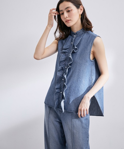 STORY6月号掲載アイテム 【素材】 サスティナブルUSAコットンを使用した軽さのあるデニム素材を使用。洗い加工時に生じる工業排水を工場内のろ過処理施設で綺麗にして再利用することで水の取水量を削減しています。薄手のデニムで着心地の良い素材です。 【デザイン・シルエット】 デニムでは珍しいラッフルデザインのノースリーブブラウスはパールボタンがアクセント。こだわりのシャツ仕様で作られたデニムブラウスは夏場のシーンで活躍できるアイテムです。さりげなく付いているパールボタンによって、カジュアルな印象から上品な雰囲気に。女性らしさを引き立てます。 【カラー】 春夏に使いやすい爽やかなブルー(少しくすみあり)の1色展開。 【その他のポイント】 セットアップで着られるサステナブルデニムパンツ(品番:GGS23230)がございます。 【おすすめのスタイリング】 同素材デニムのパンツ(品番:GGS23230)とのセットアップがお勧めですが、様々なアイテムと相性の良い一枚着デザイン。ラミーのフレアスカート合わせなどで少しヘルシーな合わせもオススメです。 ---------------------------- 透け:なし 裏地:なし 伸縮性:なし 光沢感:なし 生地の厚さ:中肉 ポケット:なし 開き方:ボタン 洗濯方法:手洗い可能 ---------------------------- 【モデル情報】 モデル身長:168cm着用サイズ:38 ※画像の商品はサンプルです。実際の商品と仕様、加工、サイズが異なる場合がございます。 ※撮影場所やライティング、お使いのモニター環境によって色の見え方が異なる場合がございます。 ※商品のカラーは画像の色味をご参照ください。動画は仕様説明のため、色味が実物と異なる場合がございます。