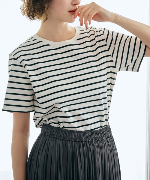 マルチ機能のベーシックTシャツ【サスティナブル素材】 【デザイン】 ワードローブに1枚は必須のクルーネックのシンプルなTシャツ。 ぴったりとしすぎないように肩を程よくドロップさせたリラックス感のあるシルエットですが、女性らしくスッキリと見えるサイジングに拘って作りました。 袖の長さは二の腕がしっかりと隠れるようにやや長めの設定にしています。 また、襟ぐりには伸縮性の高いフライスを使用しています。 ロゴをプリントした無地と、シンプルなボーダーのアソート展開です。 【素材】 USAコットンにリサイクルポリエステルのREPREVE(リプリーブ)をプレーティングした天竺素材を使用しています。 生地の表側にUSAコットン、肌側にポリエステル糸が出るように編みあげている為、 表側はコットンならではのナチュラルさがありながら、毛羽立ちが少なくクリアな表面に。 裏側はポリエステルにすることで、肌あたりがひんやりとする接触冷感機能と吸水速乾機能、UVカット機能を持たせることができており、暑い季節にも快適に着用いただけます。 ご自宅での洗濯機洗いも可能です。 【USAコットン】 アメリカ南部のコットンベルト地帯で栽培された綿花。 最新の技術と機械により効率的な栽培で品質のいい綿花が安定的に収穫され、吸収性と通気性がよく、肌触りと耐久性に富んだ丈夫な原綿です。 【REPREVE】 使用済みのペットボトルなどのリサイクル原料から作られたリサイクル繊維。 ※オフホワイト(003)、オフホワイト(303)はやや透け感があるため、インナーの着用をおすすめします。 ※この製品は、吸水速乾効果のある素材を使用しています。この効果は永久的ではありません。 こちらの商品は主に夏に着用いただける商品です。 モデル情報:身長166cm B80 W59 H86 着用サイズ:02(M) 店舗へのお問い合わせ商品番号:768-16309 ●製品寸法: 01(S):着丈58~62cm B93cm 袖丈20cm 肩幅41cm アームホール19cm 02(M):着丈60~64cm B96cm 袖丈20cm 肩幅42cm アームホール20cm 03(L):着丈62~66cm B99cm 袖丈21cm 肩幅43cm アームホール21cm 04(LL):着丈64~68cm B102cm 袖丈21cm 肩幅44cm アームホール22cm 05(3L):着丈66~70cm B105cm 袖丈22cm 肩幅45cm アームホール23cm 備考: