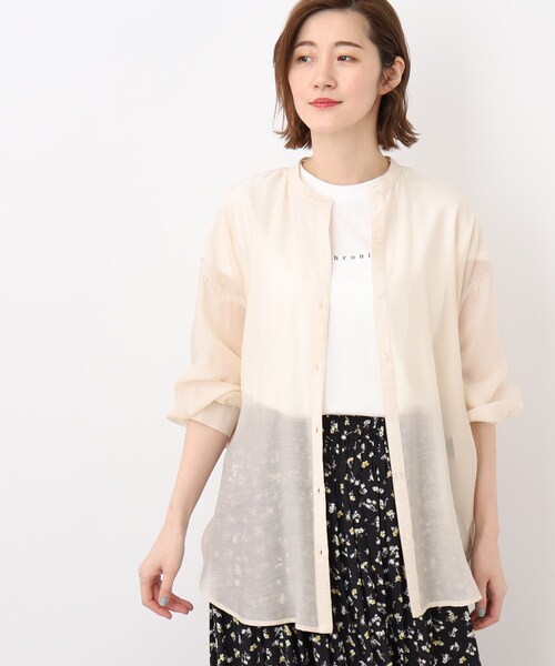 トレンドスタイルが簡単にキマる!シアーシャツ&Tシャツセット 【デザイン】 トレンドのシアーシャツとシンプルなロゴTシャツを合わせたセット商品です。 シアーシャツは今季注目されているトレンドアイテムで、透明感あるさらりとしたタッチの素材なので気温が高くなる時期でも活躍するアイテムです。 ヒップが隠れる丈感とドロップショルダーでリラックス感あるシルエットがポイントです。 インナーのTシャツはシンプルに仕上げ、合わせやすいデザインにしました。 シンプルなロゴを入れることで1枚着として真夏にも活躍出来るTシャツにしています。 ロゴの意味・・・u c h r o n i a (時間の無い国) 【素材】 シャツ・・・程よくハリ感があり、透け感ある軽い素材です。 インナー・・・ポリエステル素材とコットン素材を織り交ぜた表面がキレイな仕上がりの素材です。 ※こちらの商品はやや透け感があるため、インナーの着用をおすすめします。 【スタイリング】 インナー次第で様々な着方が楽しめるシアーシャツ。セットのTシャツに合わせた羽織りスタイル以外にも キャミソールやタンクトップをインし、前を閉めてインナーの透け感を楽しむブラウススタイルも素敵です。 こちらの商品は主に夏に着用いただける商品です。 モデル情報:身長166cm B80 W59 H86 着用サイズ:02(M) 店舗へのお問い合わせ商品番号:768-86020 ●製品寸法: 01(S):シャツ着丈72cm シャツB113cm シャツ袖丈43cm シャツ裄丈72cm シャツ肩幅58cm シャツアームホール20cm Tシャツ着丈59cm TシャツB97cm Tシャツ肩幅58cm 02(M):シャツ着丈74cm シャツB116cm シャツ袖丈44cm シャツ裄丈74cm シャツ肩幅59cm シャツアームホール21cm Tシャツ着丈60cm TシャツB100cm Tシャツ肩幅59cm 03(L):シャツ着丈76cm シャツB119cm シャツ袖丈45cm シャツ裄丈75cm シャツ肩幅60cm シャツアームホール21cm Tシャツ着丈61cm TシャツB103cm Tシャツ肩幅60cm 04(LL):シャツ着丈78cm シャツB122cm シャツ袖丈46cm シャツ裄丈77cm シャツ肩幅61cm シャツアームホール22cm Tシャツ着丈62cm TシャツB106cm Tシャツ肩幅61cm 05(3L):シャツ着丈79cm シャツB125cm シャツ袖丈46cm シャツ裄丈77cm シャツ肩幅62cm シャツアームホール22cm Tシャツ着丈63cm TシャツB109cm Tシャツ肩幅62cm 備考: