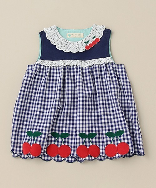 ギンガムチェックにドビーが入った変わり織りのチュニックです。 衿と裾に入ったスカラップに合わせてあしらった、さくらんぼ刺しゅうがポイント。アームホールがすっきりしているため、一枚でもカーディガンなどを羽織っても可愛く決まります。両肩ボタン開き仕様でお着替えもスムーズです。【透け感】透けない【生地の厚さ】普通【伸縮性】なし【裏地】なし【ポケット】なし