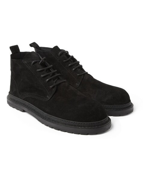 Ann Demeulemeester delivers elegance and punk attitude with these suede lace-up boots complete with substantial rubber soles. This exquisitely Italian-made pair exudes refinement. For a pared-back raffish look team them with a longer-length shirt and tailored trousers. Shown here with an Ann Demeulemeester T-shirt , Alexander McQueen trousers , Le Gramme bracelet and Maison Martin Margiela bracelet . Black suede boots Leather lined Lace-up Made in Italy Come with dust bags