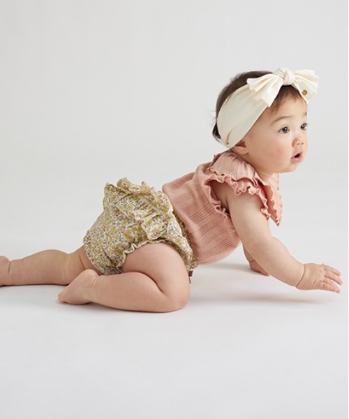 2段重ねにしたフリルが愛らしいカバーパンツです。 カラーによってパターンや風合いを変えたアソート展開。インゴム仕様でフィット感がよく、おむつをしっかり包み込んでくれます。エプロンやワンピース風のトップスと着用するのがおすすめです。【おすすめの着用時期は春夏シーズン】【透け感】透けない【生地の厚さ】普通【伸縮性】なし【裏地】あり【ポケット】なし【アジャスター】なし