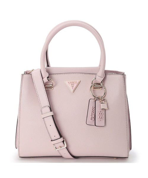 トライアングルモチーフがワンポイントになったサッチェルバッグ。2室に分かれたメイン収納で荷物の整理もしやすく、小物もすっきりとまとめられるポケット付きなのも便利なポイントです。揺れるチャームもアクセントに映えます。デートやパーティなどのオケージョンシーンにも活躍してくれるアイテムです。ショルダーストラップは取り外し可能。外側ファスナーポケット:1 内側オープンポケット:2 内側ファスナーポケット:2■GUESSについて1981年にマルシアーノ兄弟により創設され、ジーンズブランドとして始まったGUESSは、ブランド創設43周年を迎えました。ヨーロピアン・スタイルとアイコニックなビジュアルでグローバル・ライフスタイルブランドと成長し、トータルコレクションを世界80カ国以上で1500以上の店舗で展開しています。