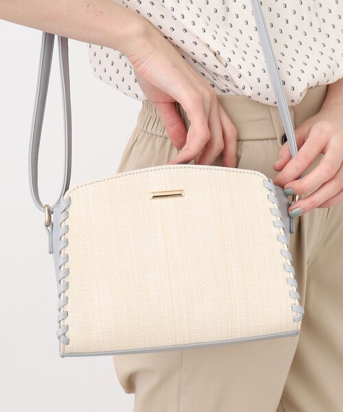 【デザイン】 雑材風のシート素材とフェイクレザーを組み合わせた上品な夏ショルダーです。 口元のラウンドフォルムにレースアップディディールを施しています。 背面はフェイクレザーにしておりオープンポケットにすることでスマホなどが取り出しやすくなっています。 本体はコンパクトにみえますが、長財布も入る大きさです。 ※ポケット数:外側×1、内側×1 店舗へのお問い合わせ商品番号:769-06056 ●製品寸法: 00:高さ16.5cm 幅(上部)23cm 幅(下部)22cm マチ6.5cm ショルダー対応サイズ63.5~118.5cm 備考:重量:約305g(サンプル重量)