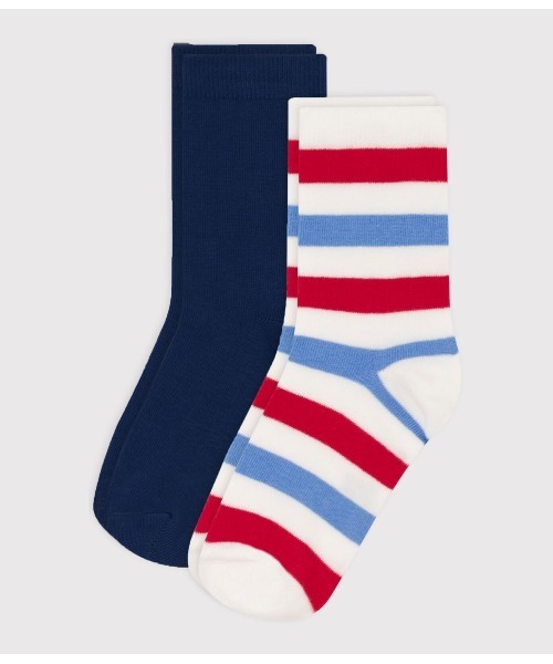 トリコロールボーダー柄、プレーンカラーで揃えたソックス2枚セットです。やわらかな肌触りと優れた伸縮性を兼備したコットンベース素材を使用。快適な履き心地が元気なキッズたちも大満足のひと品。何足あっても嬉しいアイテムはギフトにも最適です。
