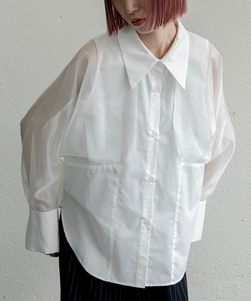 2023 VACANCY SUMMER COLLECTION◆FABRIC異素材を組み合わせた、ドッキングシアーシャツ。春夏のブラウススタイルに、他とは一味違うトレンドのスタイルをプラスしてお楽しみいただけます。ゆとりのあるシアーの袖が、柔らかなドレープ感を作り出し腕のラインを綺麗にみせてくれます。裾脇にスリットが入っているため、インでもアウトでもきまる一枚。WHITEとBLUEの清涼感あるベーシックなカラー展開でお手持ちのコーディネートにも合わせやすいのも嬉しいポイントです◎◆STYLEモードなスタイルなら、BLACKのスラックスパンツやワイドパンツとのコーディネートがオススメです。すっきりしたギャザースカートやペンシルスカートとも相性抜群です◎・・・・・・・・・・・・・・・・・・・・透け感:袖のみ(WHTは身頃も透け感あり)裏地:なし伸縮性:なし光沢感:袖ややあり生地の厚さ:薄め・・・・・・・・・・・・・・・・・・・・【お買い物をお楽しみいただく為に】▼お気に入り登録をオススメ致します▼♡をクリックして下さい。・《商品のお気に入り登録》で再入荷通知や、ラスト1点の通知、セールの際の通知も受け取ることができます。・《ブランドのお気に入り登録》で新作商品や再入荷など、お得な情報を受け取ることができます!【ATTENTION】 ※画像の商品はサンプルです。実際の商品と色味、仕様、加工、サイズ、素材等が若干異なる場合がございます。※撮影場所やお使いのモニター環境により若干お色味が異なる場合がございます。※製品によっては染料の特性上、湿った状態や汗をかいた状態での長時間の放置、または摩擦により、他のものへ色移りする恐れがありますので、着用時にはご注意下さい。 ※お洗濯は洗濯ネットを使用し、他のものとの混合洗いはお避け下さい。色落ちや色移りの原因となります。 タンブラー乾燥はお避け下さい。 ※風通しがよく、湿気の少ない日の当たらない場所で保管して下さい。 ※また製品加工上、お手元に届く際に匂いが生じる場合がありますが、 ご使用を続けていく事により匂いは軽減されます。※ご注文いただいた予約商品のお届け時期の確認は、注文履歴ページより行えます。
