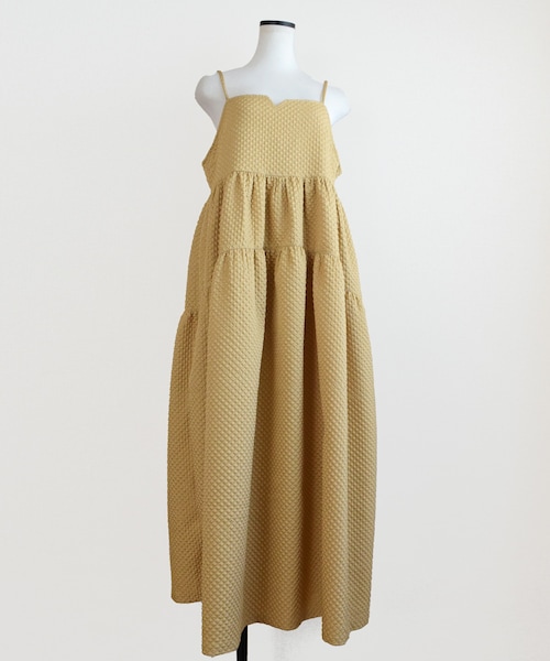 ◆アイテム詳細◆ 凹凸感のある独特の素材感が特徴のキャミワンピース。 ハイウエスト切替なので高い位置に目線がいくことで、脚長効果があるのも嬉しいポイント。 裾に向けてのボリューム感が女性らしい雰囲気をアップ!!身体のラインを拾わないので体型カバーもしてくれます!。 合わせるインナーによってロングシーズン着ていただけます◎ ───────────────────────────── 【COLOR】マスタード・ブラック 【SIZE】Fサイズ 平置き(㎝) 着丈~130(肩ひもマックスの長さ)身幅46 裾幅133 ※着丈は肩ベルトにて調整可能です 【素材】ポリエステル 100% ※裏地あり