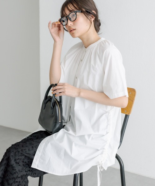 ピュアルセシン 2023 SS collection 【Town to Earth】◇スタイリングに存在感を放つ、アジャストデザインが魅力◇●商品のお気に入り登録 クーポンやタイムセール、再入荷通知やラスト1点などお得な情報を受け取ることができます。ご登録をお忘れなく◎●デザイン裾部分を絞ったり緩めたりと、雰囲気を変えて楽しめるブラウス。程よくハリ感のある生地が生み出す立体的なフォルムが目を惹きます。バンドカラーで清潔感を演出しつつ、細かなギャザーが女性らしさを演出。ゆとりのあるシルエットと長めのチュニック丈が体型カバーも叶えます。前開きにして羽織りとしても着ていただける万能アイテムです。●カラー展開オフホワイト/ベージュ/ブラックの3色展開。●素材綺麗見えするタイプライター生地を使用。程よくハリ感があるので動きのあるデザインが楽しめます。●スタイリング合わせるボトムスは、きれいめなスラックスからカジュアルなデニムまで様々なアイテムと相性が良いです。ベーシックなカラー展開なので、柄物のボトムを合わせるのもオススメ◎サイドのアジャストを伸ばしてクラシカルにも、絞ってトレンドライクな着こなしも叶います。===============================透け感:ややあり裏地:なし伸縮性:なし光沢感:なし生地の厚さ:やや薄手【スタッフコメント】年齢:20代後半/身長:158cm/普段着用サイズ:Mサイズサイズ感:着丈も袖丈も長めなので、気になる部分をしっかりカバーしてくれます。素材感:滑らかで、暑い夏でも爽やかに着れそうです。===============================※撮影場所やお使いのモニター環境により若干お色味が異なる場合がございます。特にロケの撮影では明るく見える傾向にございます。※予約商品はサンプルで撮影をしております。若干の仕様が変更になる場合がございますので予めご了承の上ご注文くださいますようお願いいたします 。