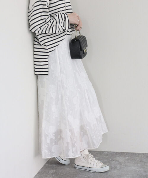 ◇fredy emue◇【2023 SS】トレンドのシアージャガード素材が今年らしいマーメイドスカート●point・トレンドのシアージャガード素材で、張り感のある素材がマーメイドシルエットもきれいに見せてくれるスカート・透け感があるので軽やかな雰囲気で着こなせ、シーズンムードを高めてくれます・花柄のジャガードが女性らしい雰囲気を演出・ウエストはゴム仕様でストレスフリーな履き心地◎・シンプルなトップスに合わせるだけで、着映えするので、オシャレ見えが叶います・合わせるアイテムを変えるだけで、ロングシーズン楽しめるのも高ポイント・ボーダーのトップスでシンプルにこなれ感のある着こなしがおすすめです透け感:あり裏地:あり伸縮性:なし光沢感:若干あり洗濯:手洗い可●お取扱い上のご注意●*商品を長くご愛用していただきたいため、アテンションタグを必ずご確認の上、着用又はお取り扱い下さい。*店頭及び屋外での撮影画像は、光の当たり具合で色味が違って見える場合があります。商品の色味は、スタジオ撮影の画像をご参照下さい。*商品画像に関しては出来る限り忠実に表示出来るよう努めておりますが、お客様がご利用のモニターの設定及び特性により、実際の商品と比較し色味に若干の誤差が生じる場合があります。*画像の商品はサンプルとなりますので実際の商品と仕様、加工、サイズが若干異なる場合がございます。◇商品のお気に入り登録◇【お気に入りに登録 ♡マークをクリック】を是非ご活用ください! 再入荷の通知や、ラスト1点の通知、セールの通知がいち早く届きます。◇ブランドのお気に入り登録◇新商品や再入荷など、いち早くブランドのお得情報が届きます。