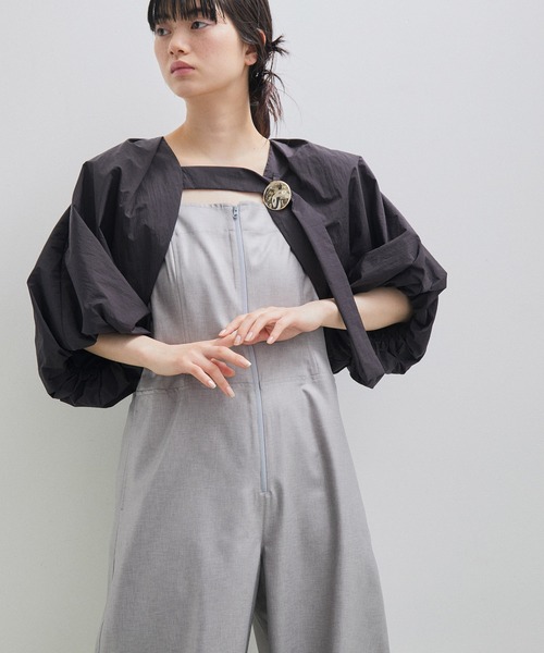 《ゴールドピン付き・取り外し可能》ふわっとしたシルエットが素敵なデイリーからオケージョンまで着回せるボレロ◇2023春夏◇ ADAM ET ROPE' FEMME 【Material】 薄手で軽い着心地のペーパーライクな風合いと、微光沢、ワッシャー加工による程よいヴィンテージ感が特徴のタフタを使用。繊維廃棄物から再生されたナイロンを使用しており、染料の一部に天然由来の色素をブレンドした、優しい色合いが特徴の、小松マテーレの商標でもあるOnibegie(R)を掛け合わせたハイブリットな素材。軽い水分ならはじく、撥水性があるのも魅力。 【Design】 バルーンスリーブが華やかな、ふわっとライトな着心地のボレロ。切り替えやバックスタイルのタック等立体感が出るようにパターンにこだわったデザイン。フロントのふっくらとしたリボンは、垂らしても、ループに通して好みの位置で着用しても素敵なデザイン。表面の凹凸感やカラーにこだわってオリジナルで作った、ゴールドカラーの丸いピンがSETされているので、ループ上部分に通して着用するのがおすすめ。 【Color】 竹炭の色素をブレンドしたブラック、ライスの色素をブレンドしたオフホワイトの2色展開。(※ピンは2色ともにゴールド) 【Styling point】 普段のスタイルに羽織るのはもちろん、ロンパースや、ベアトップにさっと羽織るスタイルもおすすめ。デイリーからオケージョンまで、様々に着こなして。 --------------- 裏地:あり 光沢感:なし 透け感:なし(ブラック) 透け感:ややあり(オフホワイト) ポケット:なし 伸縮性:なし 生地の厚さ:薄手 洗濯方法:手洗い ボタン:なし --------------- ◇モデル情報 身長:165cm size:F
