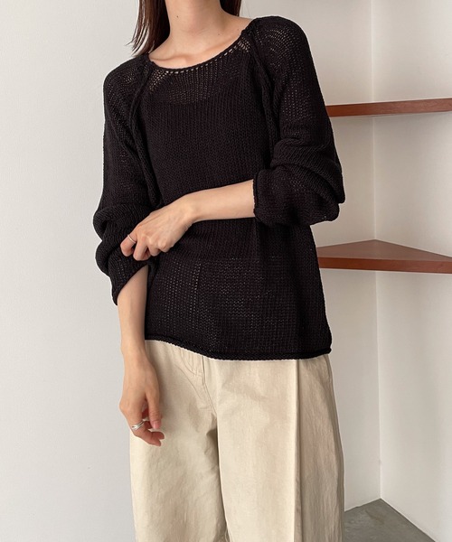 デザイン 編み目が大きく透け感があり、涼しげな1枚。 ラグランスリーブデザインでカジュアルな印象を与えてくれます。 素材 ややシャリ感のあるニット素材なので、夏でも快適に着て頂けます。 コーディネート デニムやワイドパンツと合わせた大人のカジュアルスタイルに◎ シンプルなデザインなのでどんなボトムスともコーディネートしやすく、お出かけから普段使いまで様々なシーンで活躍してくれます。 El mar(エルマール) El mar はスペイン語で『海』 海に向かうときはだれでもワクワクする。 洋服を選ぶとき、袖を通すとき、 同じように心が踊るアイテムを提案したい。 そんな『ワクワク』な気持ちを込めて El mar はデビューしました。 ------------------------------------- 生地の厚さ:厚い〇〇●〇〇薄い 伸縮性:あり 透け感:あり 裏地:なし 光沢:なし 水洗い:不可 ※ご自宅でのお洗濯は手洗い推奨 ------------------------------------- こちらの商品は生地に麻素材が含まれております。 商品は洗濯や着用中の摩擦、汗、雨等で色移りする事があります。 摩擦により下着、バッグ、ソファー等に色移りする場合があるのでご注意ください。 吸湿、速乾性に富むこの素材は、シワになりやすく、表面上、部分的にムラ、ネップ、飛び込みキズなどが見受けられる場合がございます。 また、着用の繰り返しにより多少の毛羽立ちが発生いたしますが天然素材麻の特徴ですのでご了承ください。 ※お手入れ方法 麻は水に濡れると縮みやすく、色移りがしやすい特性がございます。 長くお使いいただけるよう、お洗濯はドライクリーニングをお願いいたします。 ご家庭でお洗濯する場合は、必ず洗濯表記をご確認ください。 【ニットのお手入れ方法について】 ニットの風合いを損なわず、きれいに保ち続けるためには日頃のケアが必要です。 1日着用して湿気がこもったニットは、風通し良い場所に干し湿気を取り2-3日お休みさせてください。 型崩れさせないようにするために畳んで保管するのがおすすめです。 ハンガーで保管の場合は、肩線が崩れないように厚みのあるハンガーや木製ハンガーをご使用ください。 【毛玉のケア方法】 毛玉取り器を使い、優しく回しながら取り除いてください。 毛玉が大きいものや毛足の長いものは、毛玉をつまみハサミでカットするのがおすすめです。 -ATTENTION- ※検品基準が日本とは異なり、海外製品はメーカーの検品基準が甘く、縫製が甘い場合がございますが、全てメーカー基準を満たした商品となっておりますので、予めご了承の上お買い求め下さい。 ※末永く愛用頂く為に、アテンションタグを必ずご確認の上、着用又はお取り扱い下さい。 ※商品の写真はサンプル品を撮影している為、実際の商品とは仕様や加工、加工によるダメージ、サイズ等が若干異なる場合もございます。 ※屋外での撮影画像は、光の当たり具合で色味が異なって見える場合があります。詳細画像をご参照ください。