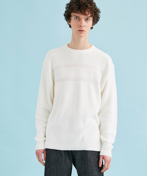 〈素材〉・透け感 なし・伸縮性 あり〈シルエット/デザイン〉 ・レギュラーフィット・7ゲージのミドルゲージニット(ほどよく隙間のある縫い方)・春先~初夏まで使える厚み・ニットながらスポーティな印象の袖切り替えデザイン・強調しすぎないデザイン、サイズなので、どんなパンツ、アウターにも合わせれる万能ニットになります。