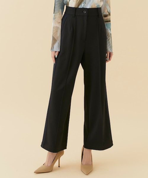 〈素材〉・透け感 無し・裏地 無し・伸縮性 あり・ポケット付き〈デザイン〉・品のよい布帛見えするカットソーのパンツ。・布帛仕立てなので、綺麗な仕上がりですが、カットソー素材なのでラクに履きこなせます。・両サイドは配色のライン切り替え入り・ON/OFF両方活躍する一枚です。