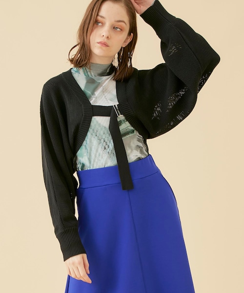 〈素材〉・透け感 あり・裏地 なし・伸縮性 なし〈デザイン〉・かわりメッシュ編みのニットボレロ・ショート丈が様々なスタイリングに合せやすくなっております。・メッシュ編みなので、気になる二の腕隠しも気持ちよく着ていただけます。・冷房対策としてもおすすめです。