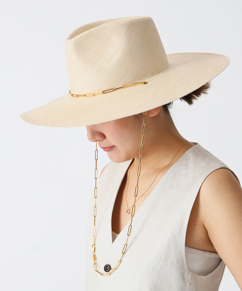 ゴールドチェーンが品よく輝く、リッチなムードのハット。上質な素材を使用した品の良いベージュの本格的な中折れハットに、アクセサリー感覚でスタイリングのアクセントになるチェーンが付属に。天然素材ながら、クリーンなカラーとゴールドチェーンが都会的。美しいフォルムが魅力的でデイリーだけでなくリゾートシーンにも。チェーンを取り外してネックレス代わりにも。【VAN PALMA/ヴァン パルマ】Van Palmaは2014年にデザイナーのVictoria SANGUINETTIが生んだブランド。エシカルできめ細やかなモノ作りが魅力です。パナマはエクアドルにて女性団体が手織りをし、ウールの帽子はフランス製、刺繍は南フランスのマルセイユの工房で作られています。※メーカー型番:LIVY JUNIOR※カラーについて弊社販売カラー名:メーカーカラー名ナチュラル(016):NATURAL※サイズについて弊社販売サイズ名:メーカーサイズ名フリー(999):57-M※取り扱いについては、商品についている取扱表示にてご確認下さい。※照明の関係により、実際よりも色味が違って見える場合があります。またパソコン・スマートフォンなどの環境により、若干製品と画像のカラーが異なる場合もございます。※商品の色味は、商品アップ画像をご参照ください。店舗へお問い合わせの際は、商品名/店舗問い合わせ番号をお伝えください。本体:洗濯不可