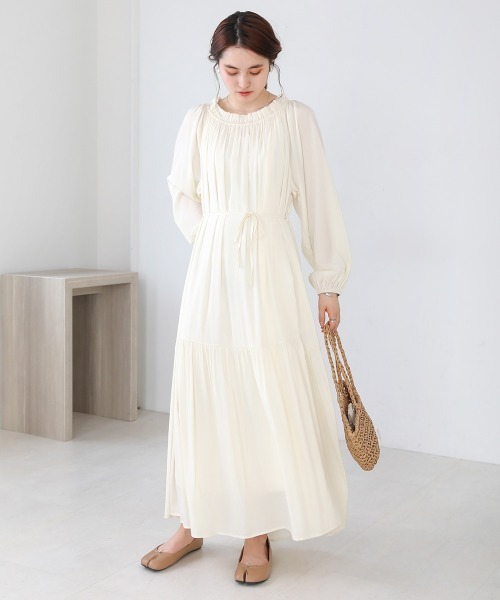 ●Bab●■POINT首元のシャーリングギャザーが素敵なワンピースが登場です。ボリューム感ある袖は長さが調節できるように袖口にゴムが施してあり、両脇にポケットが付いているのも嬉しいポイント。取り外しができる紐でウエストマークすることでシルエットも調節して着用いただけます。■FABRICサテンライクのさらっとした軽い素材感です。動くととふんわりと揺れる裾がとても素敵です。■COORDINATEワンピース1枚ではもちろん、帽子やバッグなどの小物でコーディネートにアクセントつけるのも◎またニットベストやビスチェを重ねて着るとさらにおしゃれに着こなしていただけます。…………………透け感:あり裏地:あり…………………※撮影環境により、多少実際のカラーと異なる場合がございます。また、携帯やスマートフォン、パソコンなどの画面上と実物では多少色が異なって見える場合がございます。ご了承下さいませ。※画像の商品はサンプルのため、実際の商品と若干仕様が異なる場合がございます。※濃色品は、過度な摩擦や濡れた状態での摩擦により、色落ち・色移りをする恐れがあります。※この商品は、素材の特性上、洗濯の際に多少の縮みが生じる恐れがあります。洗濯後は形を整えてから干してください。※その他お取り扱いに関しましては、商品に付属のアテンションタグをご覧ください。★商品のお気に入り登録再入荷やラスト1点のお知らせ、セール情報などお知らせを受け取ることができます!★ブランドのお気に入り登録新商品や再入荷などのお得な情報を受け取ることができますので、是非ご登録ください。★Bab公式Instagramアカウント【bab.showroom】で最新情報をチェック!