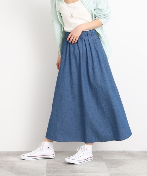 【デザイン】 前ウエストに施された大き目のタックがポイントのフレアスカート。 デニム素材でカジュアル感があり、デイリー使いにもおすすめのデザインです。 ウエストゴムで着脱もらくちんです。 【素材】 綿100%のデニム素材を使用。 程よいハリ感がフレアをきれいに見せてくれます。 こちらの商品は主に夏に着用いただける商品です。 モデル情報:身長164cm B78 W56 H80 着用サイズ:00(FREE) 店舗へのお問い合わせ商品番号:C62-76008 ●製品寸法: 00(FREE):W68~86cm H90cm 総丈88cm 備考: