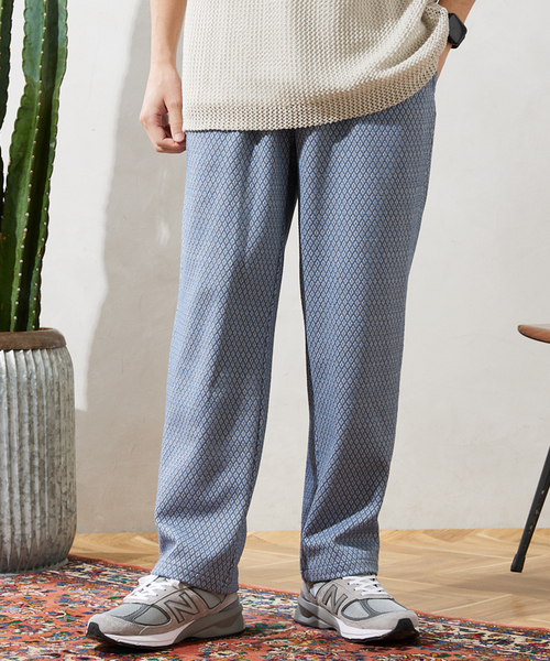 昨年大人気だったジャカード総柄ジャージーパンツが23ssも登場! 今年は前回よりも柄のモチーフを小さくアップデートしました。 様々なコーディネートに合わせやすくなり、総柄ボトムビギナーの方にもおすすめのアイテム。 プリントではなく、生地を仕立てる段階で柄が織り込まれた立体感のあるジャガード織なので生地に高級感があります。 シルエットは1タックのイージーパンツ仕様で、腿周りはゆったりとしつつ、裾に向かってややテーパードさせたシルエット。 ポリウレタン混紡で伸縮性を持たせ、腰周りはスピンドルでイージーパンツ仕様に仕上げました。 お出かけ着としてはもちろん、ご自宅や周辺でのワンマイルウェアとしても履いていただけるリラクシーな着心地です。 ********************** 透け感:なし 裏地:なし 伸縮性:ややあり 光沢感:なし 生地の厚さ:普通 ********************** 【スタッフ着用コメント】 《スタッフH》 身長:173cm/体重:62kg/体型:中肉中背/普段サイズ:M/着用サイズ:L サイズ感:見た目スッキリですが、太もも辺りは太めのサイズ感です。 素材感:凹凸のある素材感です。 着心地:肌当たりも良く、暑い日でも快適に履くことができます。 ********************** 《画像についてのご注意》 ※照明の関係により、実際よりも色味が違って見える場合があります。 またパソコン・スマートフォンなどの環境により、若干製品と画像のカラーが異なる場合もございます。 ※商品の色味は、商品アップ画像をご参照ください。 《商品のお気に入り登録について》 「カートに入れる」または「予約する」右側のハートマークを押していただくと、 再入荷、残り1点、セールなどの通知を受け取ることが出来ます。 《ブランドお気に入り登録について》 JOURNAL STANDARD relumeのトップページ右上にある「お気に入りブランドに追加」を押していただくと、 新商品や再入荷、ショップのおすすめトピックスなど、いち早くブランドの情報を受け取ることが出来ます。 本体:洗濯機洗い(弱)