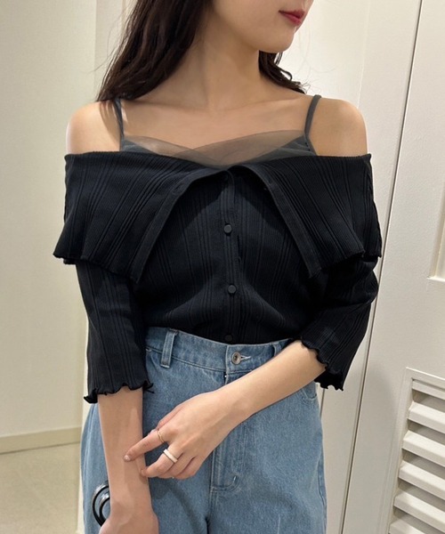 ~NICECLAUP 2023 spring collection~ セーラーカラーが可愛いテレコトップスが登場。 首回りは開きすぎないシルエットで、デコルテをきれいに見せ首を長く見せてくれます。 同色のボタンもポイントになり、シンプルな中にもぬかりない可愛さをプラス。 ボタンで開きを調節してオフショルトップスとしても着用可能。 伸縮性の良いテレコトップスで着心地も◎ 適度にフィット感がありますがビックカラーが気になる肩回りのシルエットをカバーしてくれるので、 着やせ効果抜群のトップスです。 軽い着心地のトップスなので春先まで使えるのはもちろん、 レイヤードにも使いやすい万能トップスです。 ■ オススメスタイリング 形のキレイなシンプルトップスなので、ボトムで印象も変えられます。 春先シーズンなら、デニム合わせがこなれた印象になりオススメです。 上品な合わせなら、マーメイドスカートやティアードスカートなどロングボトムも◎ オフショルで着用し、同色のインナーやカラーインナーでアクセントをプラスしたコーデもオススメです。 ------------- 裏地:なし 伸縮性:あり 生地の厚さ:普通 生地の重さ:普通 洗濯 :手洗い ------------- ※サンプルでの撮影のため、実際のものと仕様や色が異なる場合があります。 ※室内、室外での撮影のため実際より明るく映っていたり、暗く映っていたりする場合がございます。 ※品質表示を必ずご確認下さい。 【商品のお気に入り登録】 完売カラーの再入荷や、ラスト1点のお知らせ、セールの通知を受け取ることができます。 【ブランドのお気に入り登録】 新作入荷や再入荷情報など、ブランドの情報をいち早くお届けします。 ぜひご登録ください♪
