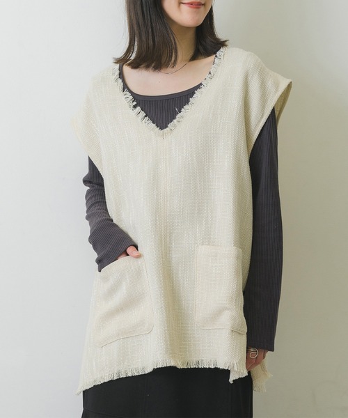 <切りっぱなしのフリンジ加工が目を引くVネックベスト> ▼デザイン プラスワンアイテムとして使えるミドル丈のベスト フロントデザインは一見シンプルで合わせやすいアイテムですが、深めのVネックが重ね着に最適! フリンジデザインもコーディネートにこなれ感をプラスします 存在感抜群でトレンドのベストスタイリングに差のつくアイテムです! ▼コーディネート カットソーとのレイヤードスタイルにぴったりの1着。 女性らしい色味でスマートな大人カジュアルなコーディネートに最適◎ 今年らしい少し長めの丈デザインはお手持ちのアイテムにプラスするだけで、今年顔のコーディネートが完成します。 ------------------------------ 生地感:普通 伸縮性:なし 透け感:なし 裏地:なし ----------------------------- #ベストコーデ #Vネック #デザインベスト #フリンジ ▼注意事項 ※撮影環境やモニター環境によって実際の商品とお色味が 多少異なってみえる場合がございます。 品番:RS356621T001 / 品名:Vネックベスト