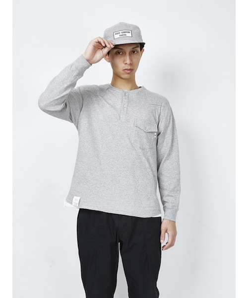 ■カットソーです。ヘンリーネックタイプとなっており、ヘンリーネック部分と左胸部分のスナップにウエスタンボタンを採用し、ロック仕様のウエスタンヨークを施した民族テイストな一品です。裾はラウンドしており、ロック処理されています。