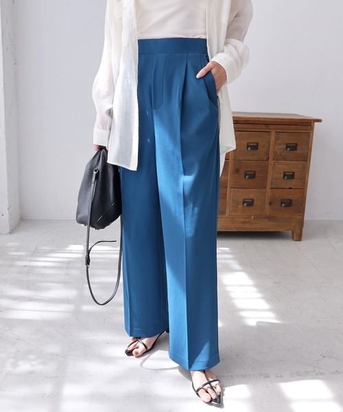 伸縮性のあるカットソー「ポンチ素材」を使用した 《動ける!楽ちんキレイめウェア》に モード感漂う、2タックワイドパンツが新登場♪ 梨地ジョーゼットのような、表面にほんのり 凹凸感とシボ感のあるポンチ素材。 てろっとした落ち感と、さらっとした肌ざわり、 ポンチ素材ながらも軽いタッチの素材を厳選しました。 伸縮性があり、裏面は滑らかな手触りが心地よく、 カットソーながらも"キレイ見え"する1枚です。 シワになりにくく、しなやかな落ち感が キレイめコーデにも◎ シーズン問わず着られて、 お家で洗えるのも嬉しいポイントです♪ ウエスト部分はゴム入りで、ストレスフリーに。 サイドポケットあり。 バックポケットはフェイク仕様で すっきりと仕上げました。 シンプルにTシャツでさらっと合わせたり、 同素材のトップスやジャケットと 合わせるのもおすすめです♪ コーデによって、カジュアルにもモードにも 着こなせるオススメの1本です! ※裏地なし ★ライトベージュのみショート丈の裏地付き ※撮影時のライティング、ご覧になっているモニター・PC環境により 実際の商品と色味が異なって見える場合がございます。 ご了承の上お買い求め下さい。 素材: 【表地】 ポリエステル95% ポリウレタン5% ※別布(ポケット裏地) 綿100% 【裏地】 ポリエステル100% ※ライトベージュのみ裏地付きとなっております。 ≪備考≫ 伸縮性:あり 透け感:薄い色若干あり 生地の厚さ:やや薄手 肌ざわり:さらっとしている その他:その他:表面にほんのりシボ感のあるポンチ素材 生産地:中国 洗濯機:可 ドライクリーニング:可 ウェットクリーニング:可