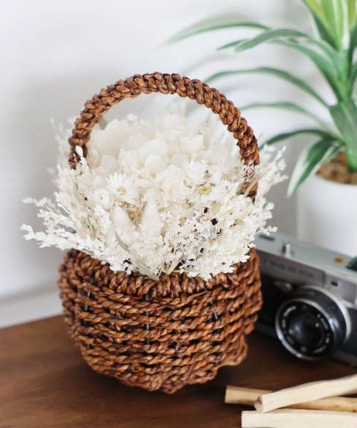 贈り物にも喜ばれるドライフラワーバスケット可愛らしいカゴに入ったドライフラワーオブジェ。コーディネートされていて、開けてすぐにそのまま飾れるので植物初心者の方にも◎日当たりや水やりを気にせず、手軽に楽しめるのもドライフラワーならでは。プレゼントにも人気のアイテムです!ーーードライフラワー インテリア グリーン 植物 オブジェ カゴ プレゼント ギフト 春ーーー