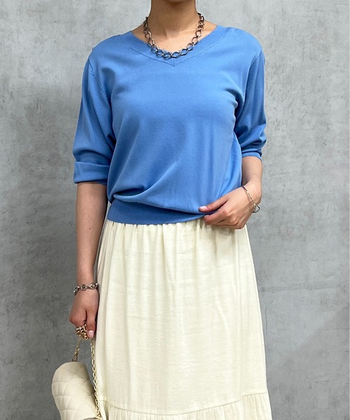 コーデを選ばない嬉しいシンプルニット 商品ポイント ・Vネックでスッキリ見え ・夏にも着られる程よい薄さ ・伸縮性が抜群のニット地 おすすめコーディネート 大人可愛いスタイルからカジュアル、オフィスコーデまで幅広くOKです! ボトムスを選ばすにスタイリングできるのが嬉しい1枚です。 素材 レーヨン65%、ナイロン35% 洗濯方法:手洗い 透け感:白のみややあり 裏地:無し 伸縮性:あり 生地の厚さ:普通 【スタッフ着用コメント】 《ちいさん》 身長:162cm/着用サイズ:F 体型:普通/骨格:ウエーブ/パーソナルカラー :イエベ秋 程よい薄さとオフィスにも着やすいデザインです。 Vネックですが、深くないのでインナー選びも困らないです。 《YUI》 身長:149cm/着用サイズ:F 体型:ぽっちゃり/骨格:ウェーブ/パーソナルカラー :イエベ春 コンパクトでもそこまで身体のラインを拾わず着れます。 ジャンスカやキャミワンピースのインナーに重宝します。 《ゆうき》 身長:152cm/着用サイズ:F 体型:ぽっちゃり/骨格:ストレート/パーソナルカラー :イエベ春 私でも着れますが、少しぴたっとするのでジャンスカやジャケットのインナーとして着用しております。 腰位置で止まるのでアウトスタイルもおすすめ! 《RINO》 身長:148cm/着用サイズ:F 体型:普通/骨格:ストレート/パーソナルカラー :ブルベ冬 コンパクトなニット♡ Vネックなので、顔周りもすっきり見え 骨格タイプ ストレート:全体的に立体型で筋肉質。ひざ下はすらっと細め。ボディラインにメリハリがある。 ウェーブ:上半身が薄く、華奢。緩やかな曲線のボディライン。下半身に重心があり女性らしい体型。 ナチュラル:筋肉や脂肪があまり感じられない体型。腰の位置が高く骨や関節が目立ちやすい。 ============================ 【注意点】 ※画像の商品は光の照射や角度、お使いのモニター環境により、 実物と色味が異なる場合がございます。 あらかじめご了承下さいませ。 ============================ 【お買い物をもっと便利に楽しく♪】 『♡』をクリックでお気に入り登録 ・「商品のお気に入り登録」で・・・ ラスト1点や再入荷の通知が届きます。 登録して頂いた商品だけが対象となる、あなただけのタイムセールが開催されることも! ・「ブランドのお気に入り登録」で・・・ 新商品や再入荷など、いち早くブランドのお得な情報を受け取ることができますので、ご登録をおすすめします! ============================