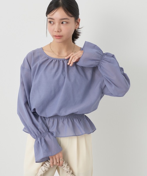 【non-noモデル紺野彩夏着用アイテム】 袖先のデザインがスタイリングに華やかな印象を与えてくれるブラウス。 シャーリングを施し、フェミニンなムードを演出します。 丸みを帯びたネックデザインで、やわらかな雰囲気をプラス◎ 様々なボトムスに合わせやすく、幅広く活躍してくれるアイテムです。 透け感[有り] 裏地[一部有り] 伸縮性[無し] 光沢感[無し] 生地の厚さ[薄手] 付属品[無し] ポケット[無し] ●製品寸法: F:バスト57.5cm 着丈55.5cm 袖丈52cm 肩幅51.5cm 裾幅59cm 備考: