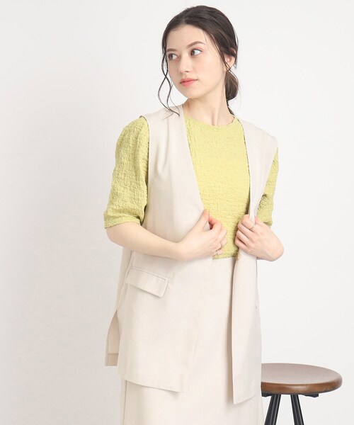 【デザイン】1枚持っていると重宝するシンプルなVネックジレ。コーディネートのポイントとして大活躍すること間違いなし!Tシャツやインナーに羽織るだけでトレンド感も出せるので、便利なアイテムです。※ポケット数:横×2【素材】麻のような見た目ながらもお手入れ簡単なポリエステル素材を使用。同素材のスカート(256-76001)と合わせてセットアップとして着用することもできます。※裏地なし※ナチュラル(050)はやや透け感があります。#CutieBlonde#Cutie#cutieblonde#cutie#キューティブロンド#キューティ#20代#30代こちらの商品は主に夏に着用いただける商品です。モデル情報:身長160cm B78 W59 H85 着用サイズ:00(FREE)店舗へのお問い合わせ商品番号:256-26001●製品寸法:00(FREE):着丈72cm B100cm 肩幅39cm備考: