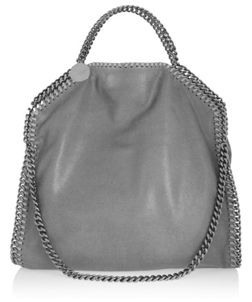 Stella McCartney's light-gray faux brushed- leather shoulder bag is soft and spacious. It will easily hold your larger everyday essentials and includes separate compartments for your cell, cards and keys. The polished chain trims are an iconic feature of this 'Falabella' style. Light-gray faux brushed-leather Magnetic snap fastening at top Comes with dust bag