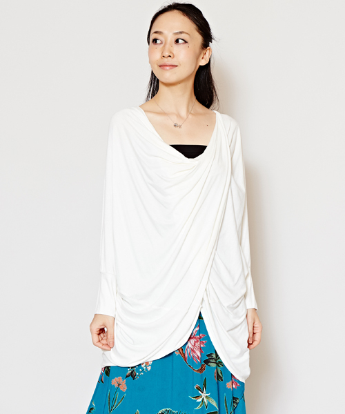 テロンとしたなめらかな肌ざわりのカットソーで、ドレープが綺麗な変形トップス。シンプルな無地で着回し力抜群!ワイドパンツやロングスカートなど、様々なスタイルに合わせやすいデザインです◎ ※こちらの商品は1点1点職人による手作りとなります。その為、形や色合いなど若干異なる場合がございます。(商品画像と実物とでは多少色味に違いがある場合がございます。)あらかじめご了承ください。 Amina Collection Co.,LTD.