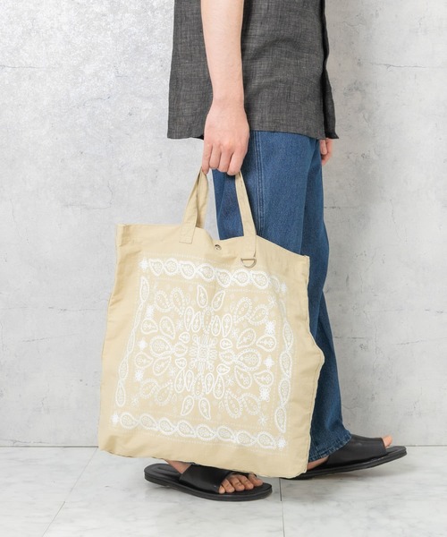 丈夫さ、軽さ、機能性、三拍子そろったペイズリー柄トートオリジナルのペイズリー柄をプリントした2WAYトートバッグ。綿とポリエステルの混紡生地を格子状に織り込むことで、ほつれたり、破れたり、劣化しにくいリップストップを使用したナップサック。引き裂き強度、摩擦にも強く、耐久性が高いだけでなく軽量かつ肌触りが良くナチュラルな風合いが特徴です。ショルダー部分をお好きな長さにギャザー調節できるので、肩掛けでも、斜めがけにしてショルダーバッグやシンプルトートとしても使える優秀なデザイン。持ち手付け根にDカンが付属されており、お手持ちのポーチや鍵等ドッキング可能。内装にはスマホ等収納可能なオープンポケット付き。普段のお出かけから、レジャーや軽量で折りたたむとサブバッグとしても使いやすい優秀トートです。【2023 Spring/Summer】※A3サイズ収納可能※この商品は、摩擦や汗、雨などの使用条件等により、色落ちや他の物への色移りの可能性がございますのでご注意ください。※その他お取り扱いに関しましては、商品に付属のアテンションタグをご覧ください。総重量 : 約160g※商品画像は、光の当たり具合やパソコンなどの閲覧環境により、実際の色味と異なって見える場合がございます。予めご了承ください。※商品の色味の目安は、商品単体の画像をご参照ください。▼お気に入り登録のおすすめ▼お気に入り登録商品は、マイページにて現在の価格情報や在庫状況の確認が可能です。 お買い物リストの管理に是非ご利用下さい。