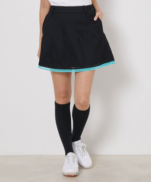 表地:<手洗い可> 裏地:【ECO】<UV><接触冷感><防透> 【シルエット】 ヒップはスッキリしながら、裾にかけて程よいフレアーシルエットのスカート。 大人っぽく脚がきれいに見えるバランスで、どんなトップスにも合わせやすいアイテムです。 【デザイン】 スポーティな雰囲気のチェッカーレース素材のスカート。 裾には配色のメッシュレースをコンビ使いにした他にはないデザインです。 【素材】 スポーティさも備えたチェッカーレースの下面には、<防透><UV><接触冷感>機能を備えた高機能素材を採用し、安心して着用出来る仕様にこだわりました。 上品な質感と軽やかさが特徴のスカートです。 【スタイリングポイント】 シンプルなデザインなのでいろいろなトップスとも相性抜群。 同素材のサンバイザーやカラーリングを合わせたコーデでセットアップ感のあるワンランク上の着こなしもオススメです。 ーーーーーーーーーーーーーーーーーーーーーー 裏地:なし(別インナーパンツ付き) 光沢感:なし 透け感:なし ウエスト:ゴムなし ポケット:あり 伸縮性:あり ーーーーーーーーーーーーーーーーーーーーーーー 【モデル着用サイズ】 ボトム詳細画像:身長:163cm 着用サイズ:M 全身画像 イエロー:身長:167cm 着用サイズ:M ※付属でインナーパンツが付いています。 ※実際の商品はお客様のお使いの端末や閲覧環境により、写真と実物の色味や質感が多少異なって見える場合がございます。予めご了承ください。 JUN&ROPE’(ジュンアンドロペ) 2つのゴルフコース「ジュンクラシックカントリークラブ」「ロペ倶楽部」を有するJUNがお届けするゴルフウェアブランド。