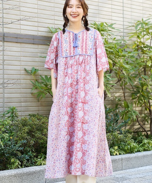 風合いあるボタニカル柄のブロックプリントが大人可愛いワンピース ■デザイン コットンの素朴な素材感とブロックプリントの独特な配色が味のある一枚。 雰囲気の異なる草花模様の3種類の柄を、パッチワークでタテに切替えたチチカカらしいデザインに仕上がっています。 胸元部分がキルティングになっているのもポイント。 綿密に手彫りされた木版でハンコのように手作業でひと押しひと押し丁寧にインクを生地にのせていく、インドの伝統工芸「ブロックプリント」で仕上げた華やかな柄が着るだけで明るい気持ちにしてくれます♪ ■サイズ感 レディースフリーサイズ ふんわりと広がるAラインシルエットです。 ■素材感 薄手で柔らかなコットン素材を使用しています。 ■スタイリング 1枚ではもちろん、カジュアルにデニムやレギンスを合わせるのもおすすめ。 ■カラー ブルー/ピンク --------------------------------- 透け感:透けない 伸縮性:なし 裏地 :あり 光沢 :なし 生地の厚さ:薄手 ポケット:あり --------------------------------- 【ブロックプリント商品について】 この製品はファッション性を重視し、ブロックプリント(ブロック状のハンコに染料を浸し一つ一つ手でプリント)を施しています。 そのため色むらがあり、一着ごとに色や風合いの仕上がりが異なります。手作りの風合いをお楽しみ頂き、ご了承下さい。 色落ち色移りしやすいためご着用や、お洗濯の際には下記の点にご注意下さい。 ・バッグやアクセサリーの擦れにご注意下さい。 ・お洗濯の際他の物と一緒に洗わないで下さい。 ・濡れた状態での放置や、他の衣料と重ね合わせると色移りしますのでご注意下さい。 【TITICACAのお買いものをお楽しみいただくために!】 ▼商品のお気に入り登録 完売カラーの再入荷通知や、ラスト1点の通知、セールの通知も受け取ることができます。 ▼ブランドのお気に入り登録 新商品や再入荷など、いち早くブランドのお得な情報を受けることができます!