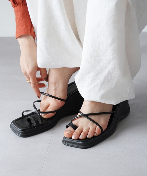 華奢なラインが女性らしいウエッジソールサンダル。 甲でクロスするデザインと細いストラップで脚を綺麗に見せ、春夏のコーディネートに抜け感をプラスします。 スクエアトゥデザインと親指リングでこなれた雰囲気に。 親指リングは靴ずれ防止にもなっているのでリラクシーな履き心地が叶います。 太めのヒールで歩きやすく安定感があるのも嬉しいポイントです。 ロングスカートやワンピース等のレディライクなアイテムにはもちろん、 パンツスタイルとも相性良く履いていただけます。 ※ 撮影時の照明などの環境と、モニターに表示される色味がメーカーにより変わってしまう等の理由により、実際にお届けする商品と、ご覧になられているアイテムの色が若干異なる場合がございます。ご了承下さいませ。