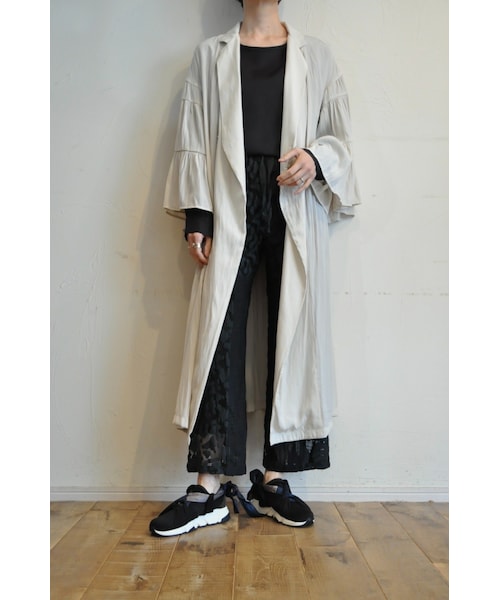ビンテージな要素を詰め込んだリラックス感のある1枚。 普段着にさっと羽織ればきちんとした印象を与える便利なガウンです。 ティアードになった袖、ワイドな身幅、たっぷりギャザーの入ったバックスタイルと、贅沢に生地を使っています。 サイドに垂れる紐を結ぶとドレスとしても決まります。 両脇にポケット有り。