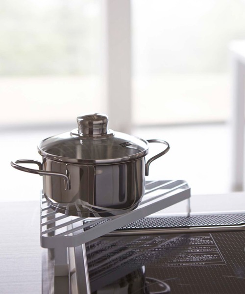 コンロ角のデッドスペースを有効活用して、調理中のお鍋のちょい置きスペースを確保できる便利なコーナーラック。安定性があり、スペースを有効活用できる優れものです。3本の脚で支えるのでガタツキも少なく、中身の入ったお鍋も安心して置くことができます。耐熱温度は約200度なので火のそばで使用したり、火から降ろしたてのお鍋を乗せてもOK。最近はフラット仕様のコンロが多いので、調理中のお鍋のちょい置きスペースとしても大活躍してくれますよ。脚にはシリコンカバー付きなので、調理台を傷つけることもありません。スペースの限られたキッチンの収納力をアップする快適ラックです。 サイズ:約幅 22×奥行き 22×高さ 5cm重量:約365g 耐荷重:約5kg 耐熱温度:約200度 【tower/タワー】 山崎実業の人気シリーズ「tower」。インテリアになじむシンプルでスタイリッシュなデザインと、便利さを兼ね備えた商品群。使いやすさが話題で毎日の生活をより快適にしてくれるシリーズです。