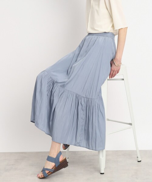【デザイン】今年らしい1段ティアードスカート。ひざ当たりの切替が足元をすっきりみせてくれ、大人っぽい印象に。ウエストゴムで着脱もらくちんです。【素材】少しシボ感のあるヴィンテージサテンを使用。程よい落ち感と、なめらかな肌触りがポイントです。モデル情報:身長167cm B78 W62 H88 着用サイズ:00(FREE)店舗へのお問い合わせ商品番号:C62-76010●製品寸法:00(FREE):W64~76cm H88cm 総丈88cm備考: