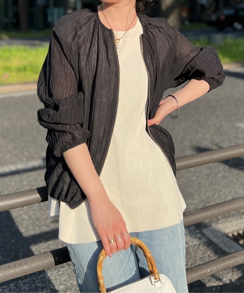 【好評につき新色追加!】ほんのりシアー素材で品のある着こなしに 季節らしさを感じるシアーブルゾン ■point ドライタッチな楊柳生地が心地良いシアーブルゾン。 やり過ぎない透け感で適度な肌見せになり、涼し気に着ていただけます。 両サイドの裾部分にはドロストが付いており、ギャザーを寄せると丸みのあるデザインに。メリハリのあるデザインになっています。 カジュアルにも、きれいめなスタイリングにも合わせやすいシンプルシルエットなので、お出かけの時にさっと羽織れる便利アイテムです。※オフホワイトのみ生地の凹凸が控えめになります。 ■coordinate Tシャツやタンクトップで合わせて、ノースリワンピースの羽織として。 裾を絞るとギュッとブラウジングができるので、ハイウエストのパンツやフレスカートで合わせてもバランスよく合わせていただけます。 ■fabric ポリエステル65% 綿35% -------------------------------------------------- 裏地:なし 光沢感:ややあり ポケット:なし 伸縮性:なし 生地の厚さ:薄手 洗濯方法:手洗い可 -------------------------------------------------- ※商品画像は着用イメージです。 光や角度により、実物と色味が異なる場合がございます。また表示のサイズ感も実物とは若干異なる場合もございますので、ご了承ください。 ※着用、お取り扱いの際は、商品についている品質表示とアテンションタグを必ずご確認ください。 -------------------------------------------------- ♡をクリックでお得な情報をお知らせいたします。 <商品お気に入り登録> お気に入りアイテムのお値下げ・再入荷・在庫ラスト1点など通知を受けることができます。 <ブランドお気に入り登録> Chez toiの新商品・再入荷・SALE・クーポン配布などお得な情報を受けることができます。 -------------------------------------------------- Cheztoi/シェトワ フランス語で「あなたの家」という意味。 自分にまっすぐでそしてしなやかに生きる女性に向けたブランドです。