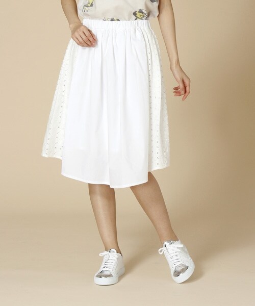 タイプライターのバイオ素材とラッセルレースのコンビネーションが今年らしいスカート。お好みでレース部分を脇にもってきたり、センターにもってきたりとアレンジも自由自在です!穿き方によってヘムラインが前下がりになったり、脇下がりになったりと表情の異なる着こなしがお楽しみいただけます。ナンバリングニットや、スポーティなアイテムをプラスワンしたスタイリングが今年流♪