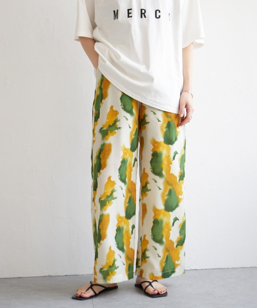 タイダイ柄のようなニュアンスたっぷりな水彩柄のパンツ。ウエストはゴム仕様で履き心地も快適です。【Detail】バックウエストのみをゴムにすることで、リラックスしつつも前から見た時のきちんと感はキープ!トップスINスタイルもきれいにまとまります。【Color】華やかな水彩柄も、それぞれ落ち着きのあるカラーで大人の女性におすすめ!【Fabric/Texture】軽やかなデシン生地を使用。裏地付きで安心です。【Coordinate】存在感たっぷりの柄物パンツは、シンプルなTシャツやブラウスを合わせるだけで華やかなコーデが即完成!お出かけからご近所コーデ、旅行などのバカンスにもおすすめです。※ご覧のモニター環境により、画像の色味と多少異なる場合がございます。[洗濯方法]洗濯の際はネットを使用してください[クリーニング]手洗い可、ドライクリーニング可(F)、ウェットクリーニング(W)