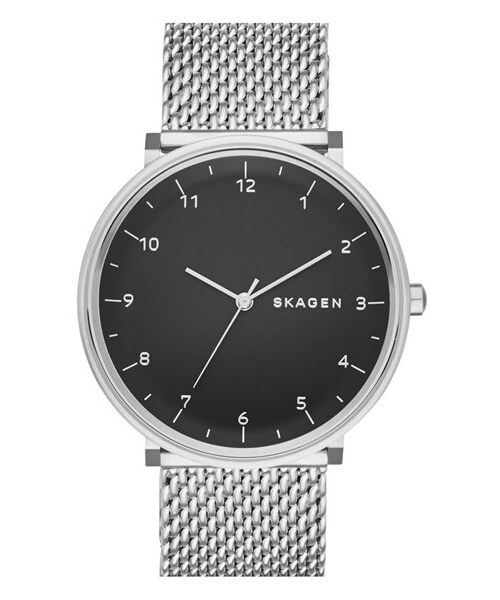 A clean sandblasted dial displays three-hand time on a crisp round watch set on a fine mesh band. 40mm case; 22mm band width. Safety clasp closure. Water-resistant to 3 ATM (30 meters). Three-hand quartz movement. Mineral crystal face. Stainless steel or stainless steel with gold or black plating. By Skagen; imported.